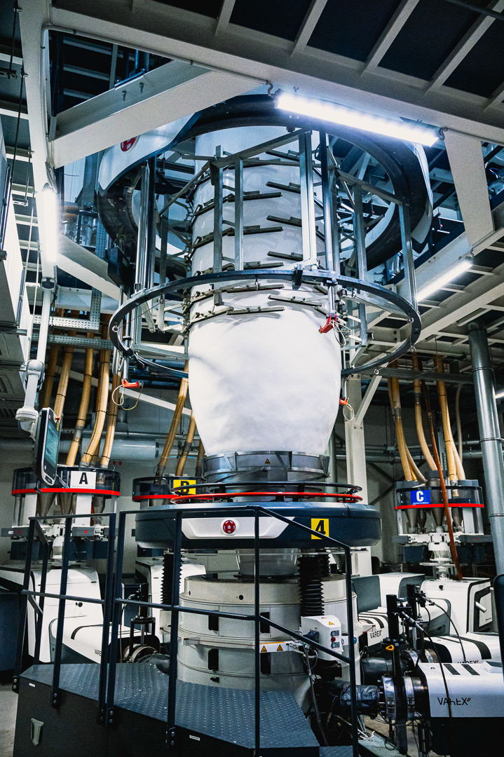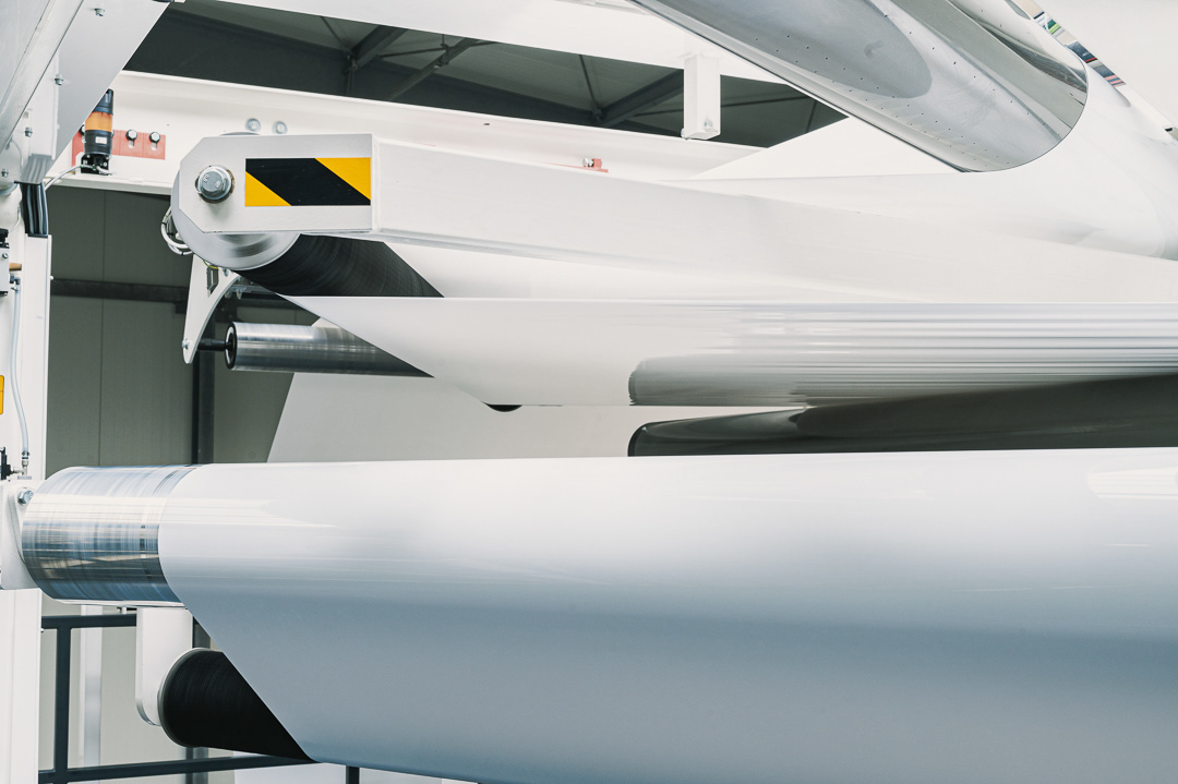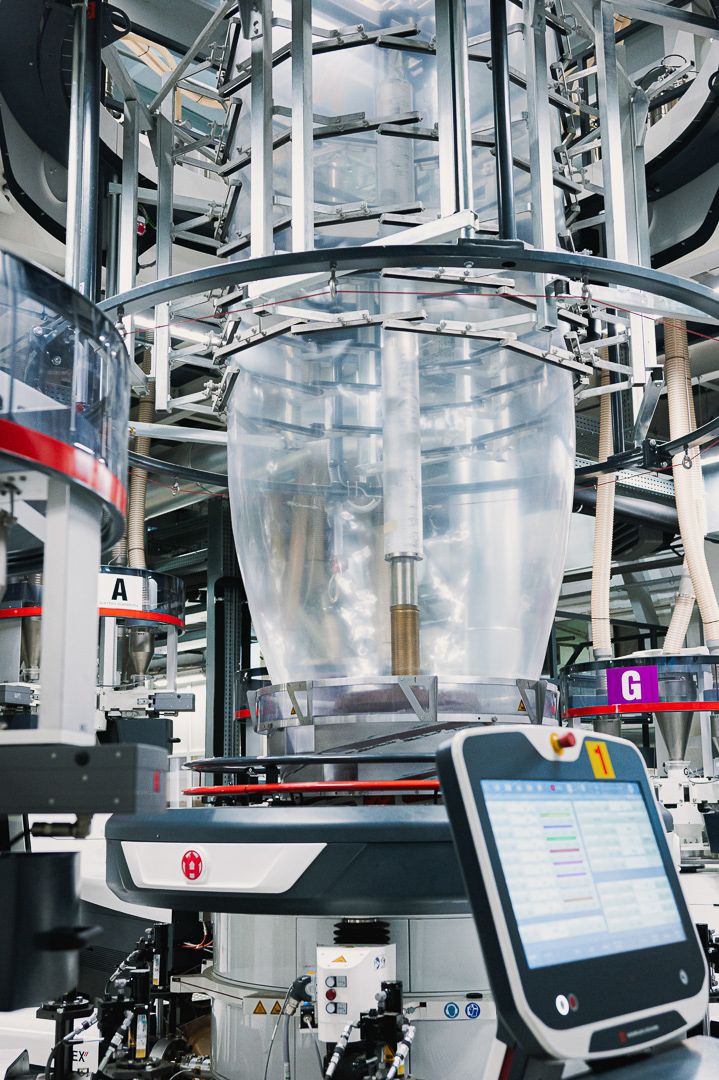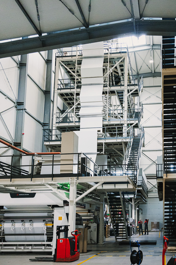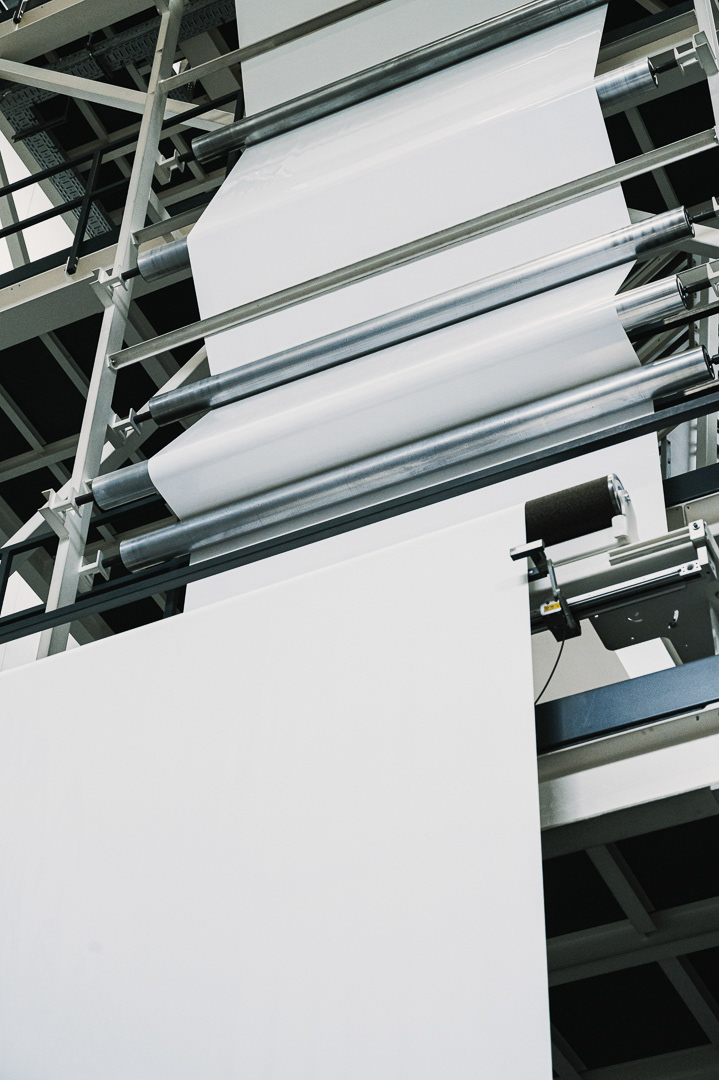 Skupiliśmy się na uchwyceniu kluczowych etapów produkcji: od tworzenia rękawa foliowego, przez transport surowca i jego obróbkę, aż po gotowy materiał schodzący z maszyn. Zdjęcia podkreślają skalę hali, czystość procesu oraz zaawansowanie technologiczne zakładu.